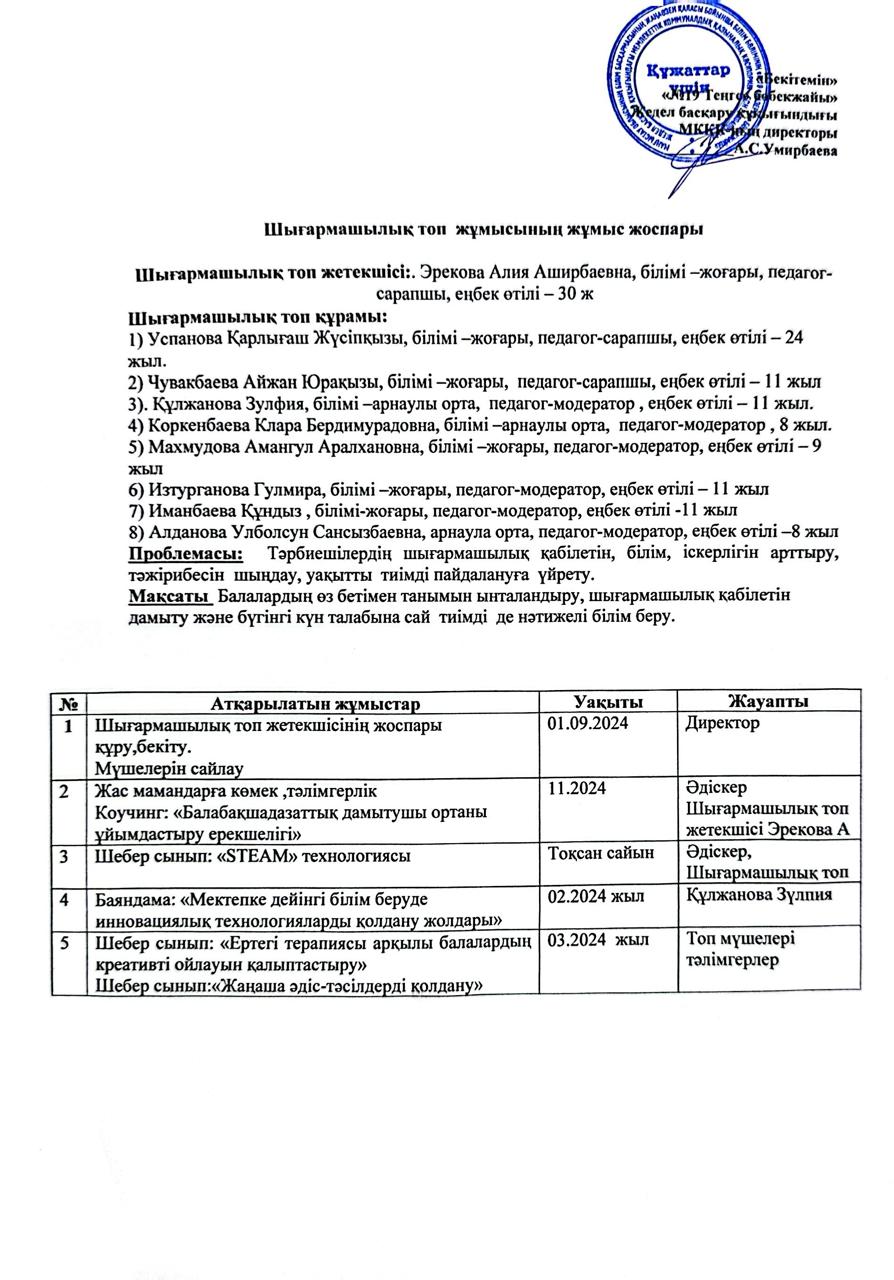 Шығармашылық жұмыс жоспары